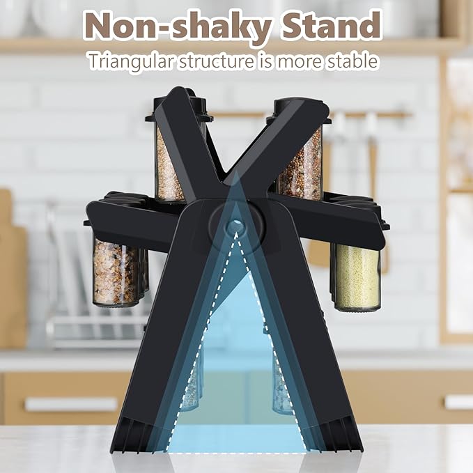 The spice rack organizer with jars and labels can be rotated 360°. Just turn it gently and you can quickly retrieve the item in 2 seconds, effortlessly.