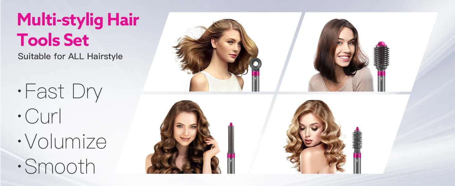 5-in-1 Multi-Styler – Includes auto-air-wrap curlers, an oval volumizing brush, a high-speed blow dryer, and a round brush.