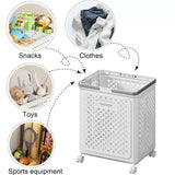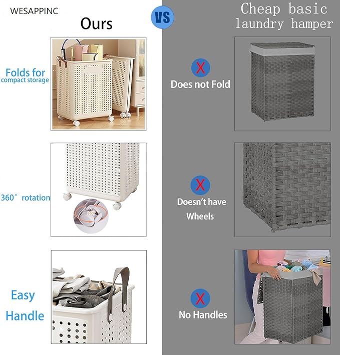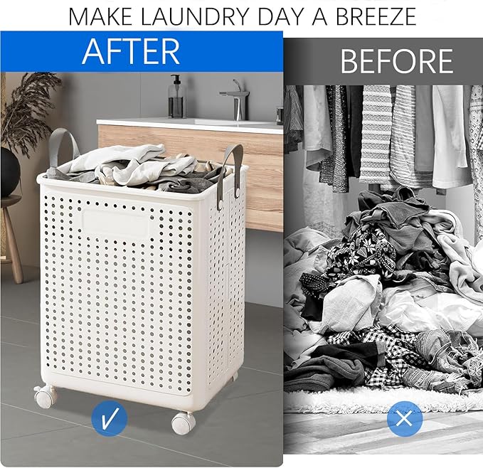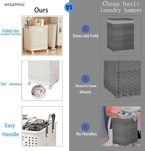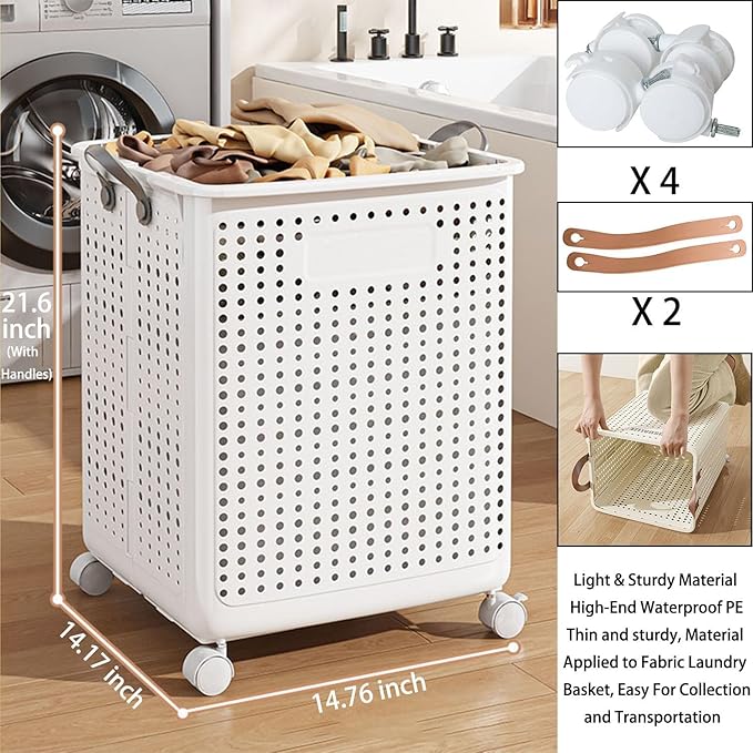 WESAPPINC 55L Collapsible Extral Large Laundry Hamper, Plastic Laundry Basket with Wheels,Suitable for Bathroom, Bedroom, Dorm Room & Laundry Room,Basket with Handle (White)
